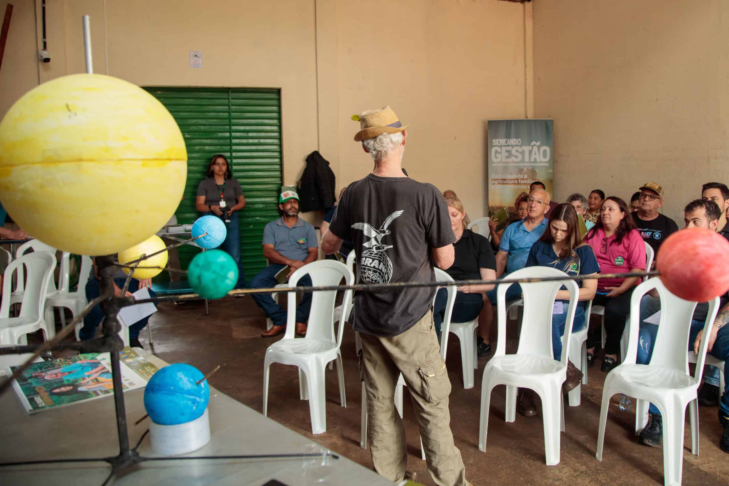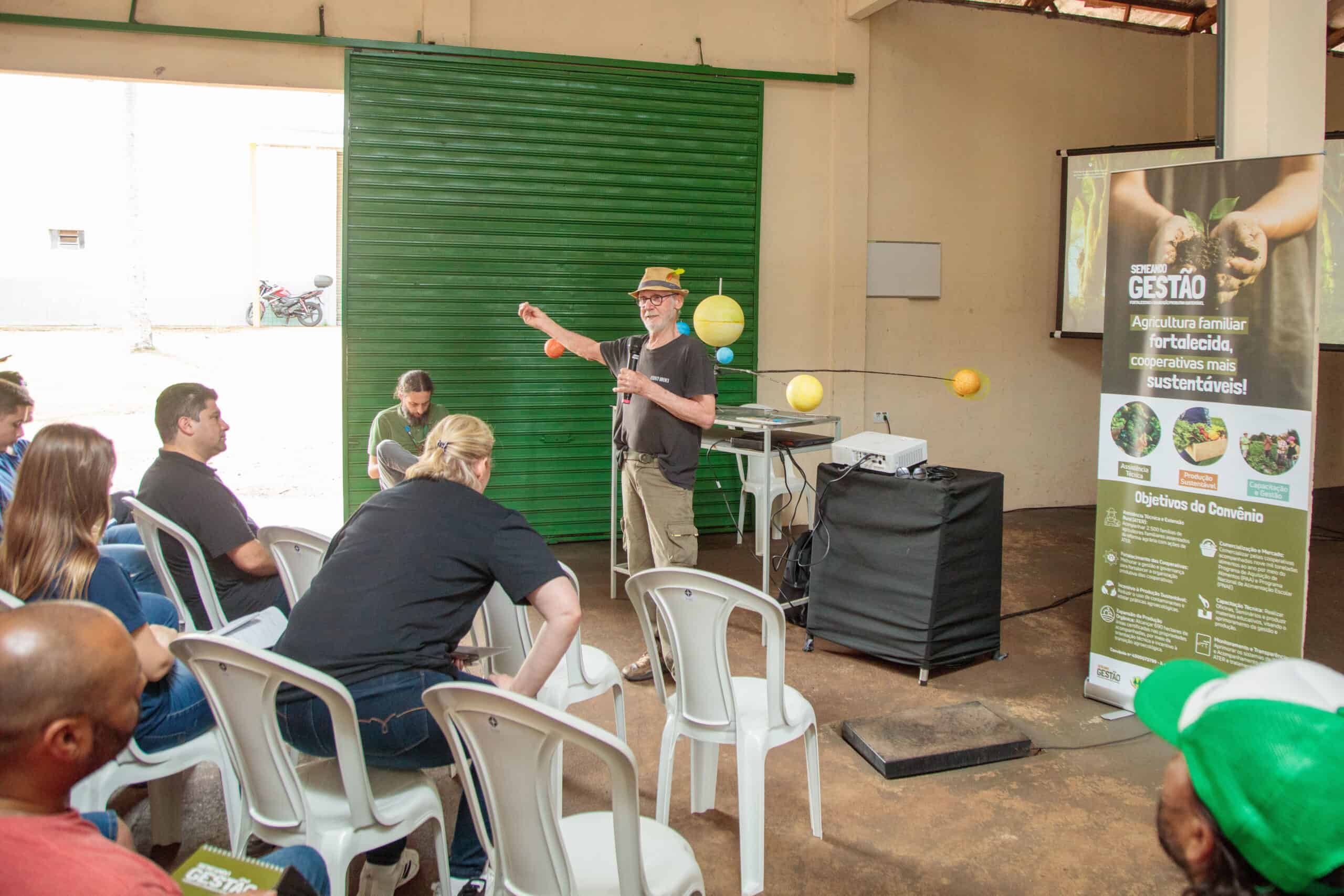 A atividade teve como mediador o agricultor e ativista da agroecologia Mário Barbarioli, referência nacional na promoção da agricultura biodinâmica. Para ele, a oficina é uma oportunidade de reconexão com o cosmos: “A oficina tem uma primeira parte astronômica, em que tento mostrar como estamos inseridos nesse sistema maior e como isso influencia no nosso corpo, no nosso modo de pensar e de viver. A ideia da biodinâmica é trazer essa percepção de que assim como uma árvore, um animal, uma pedra, nós também somos parte desse todo”, explicou.