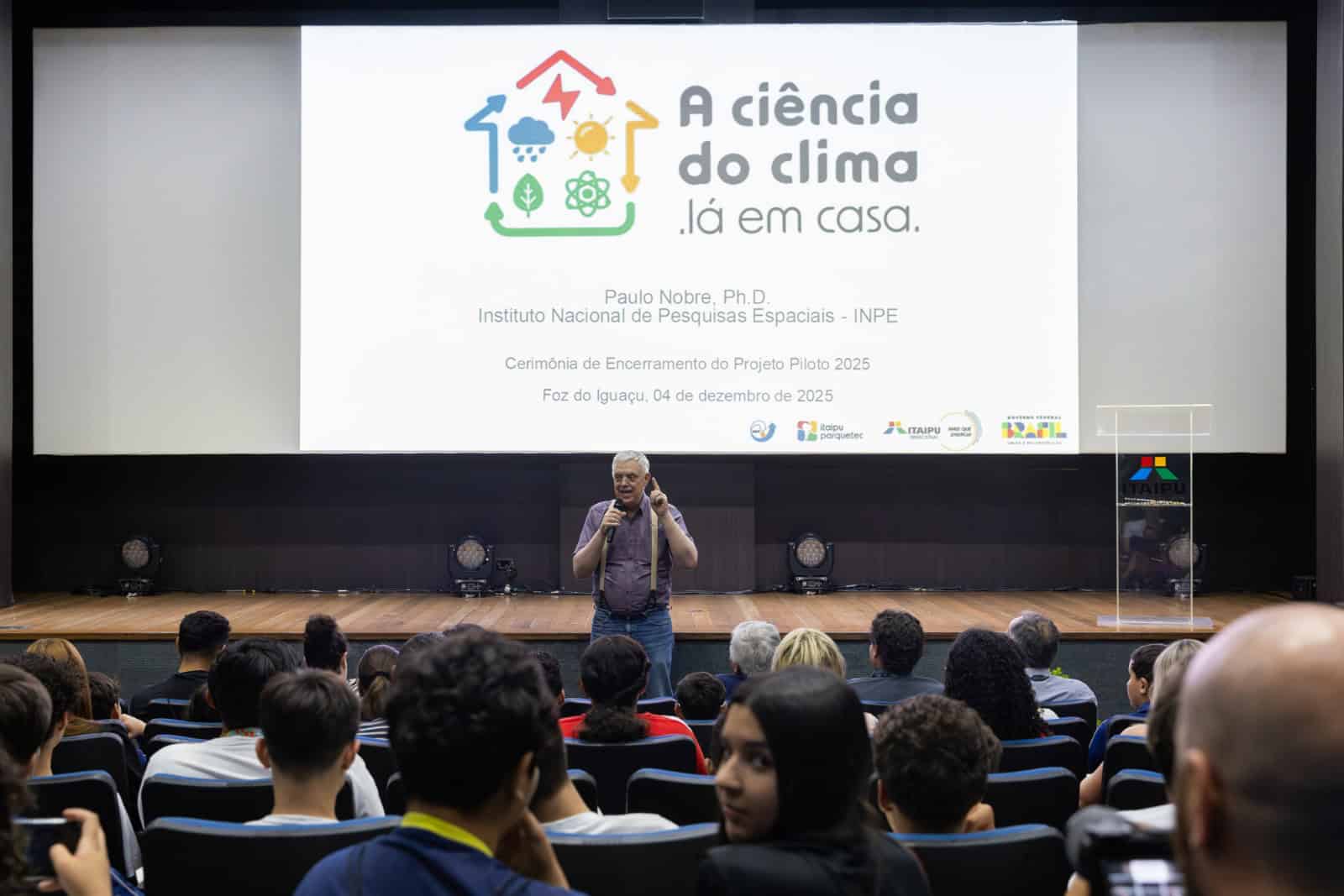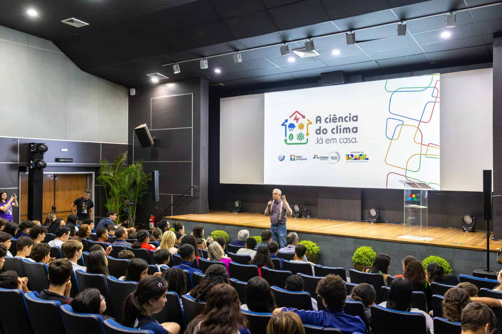 Com pluviômetros caseiros, cerca de 300 estudantes de 10 escolas de Foz do Iguaçu (PR) e de Belém (PA) aprenderam a registrar dados reais sobre períodos de chuvas e de estiagem, e a produzirem seus próprios boletins meteorológicos, divulgados por meio de podcasts. Essa é a proposta do projeto Ciência do Clima Lá em Casa, uma parceria entre a Itaipu Binacional, Itaipu Parquetec e o Instituto Nacional de Pesquisas Espaciais (Inpe), desenvolvida ao longo de 2025 e que contou com sua atividade de encerramento nesta quinta-feira (4), no auditório do Centro de Recepção de Visitantes (CRV), da Itaipu.